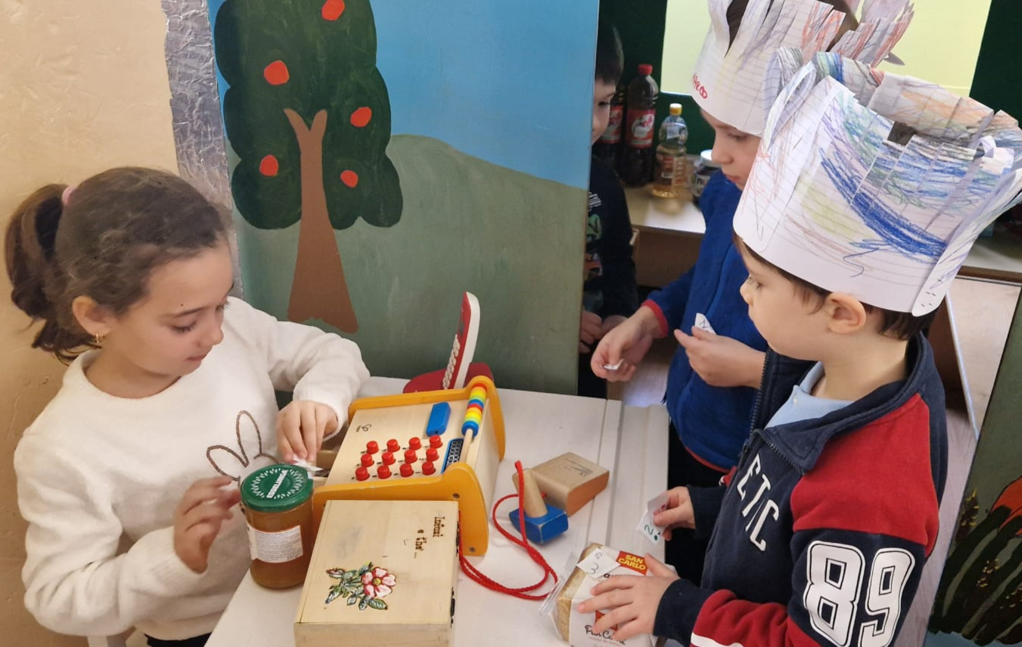 Una sezione della scuola si è trasformata in un vero e proprio supermercato, completo di prodotti, scaffali e cassa. Qui i bambini hanno imparato a scegliere, pagare, dare e ricevere il giusto resto, avvicinandosi in modo concreto ai primi concetti di educazione economica e matematica.